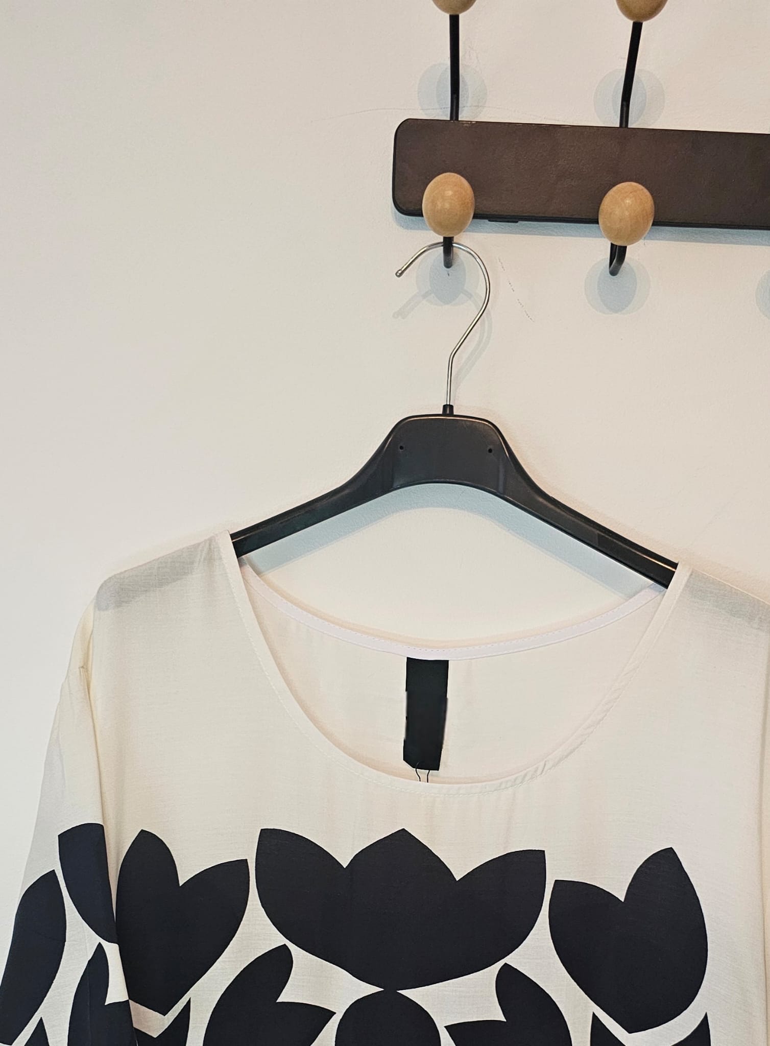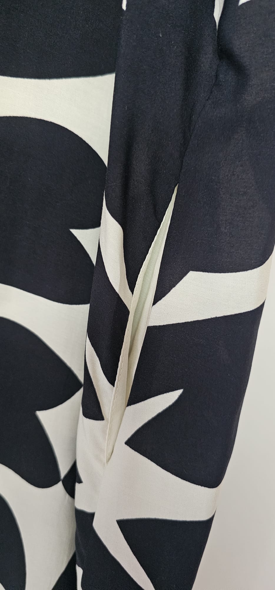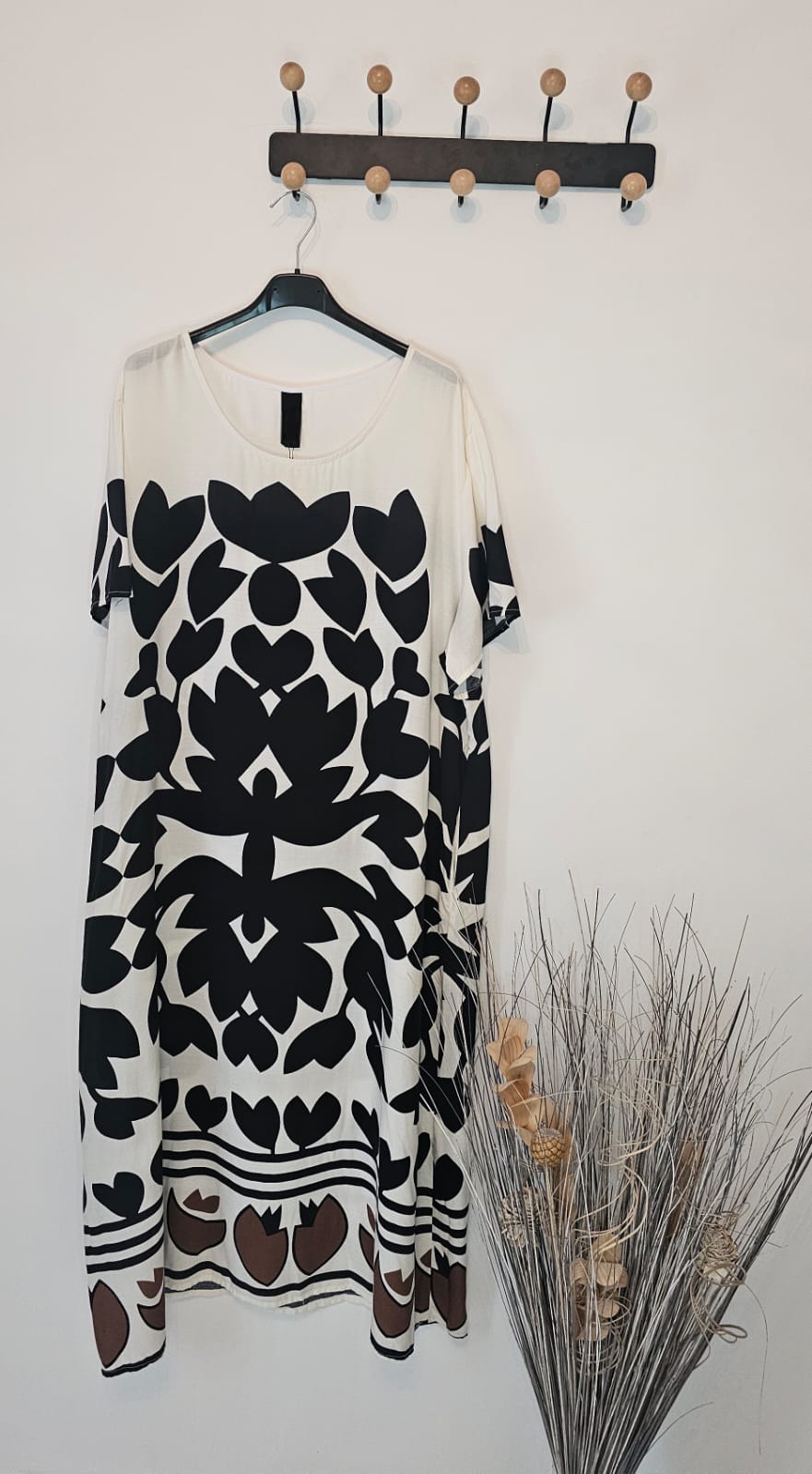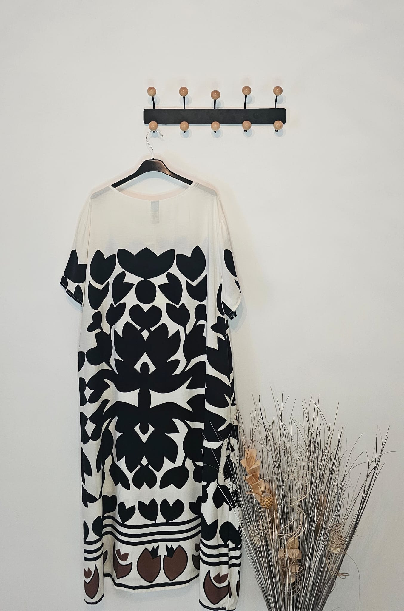 Caractéristiques ÉlégantesRobe trapèze avec une touche de style graphique.Manches courtes et col en V pour un confort optimal.Parfaite pour les occasions décontractées ou les vacances.Motif écru et noir pour un look estival chic et original.